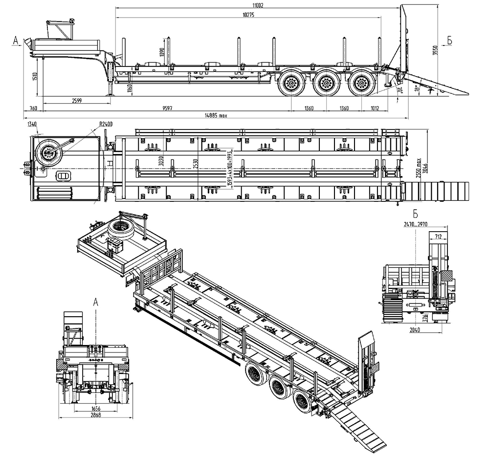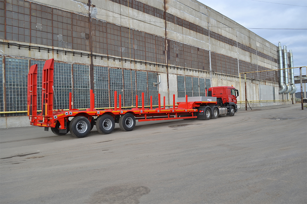 39000 кг, шины 385/65R22,5 или 445/65R22,5 / 6+1, платформа 11080 до трапов) x 2500 с уширителями до 3000 мм, ССУ 1510 мм, пневматическая или рессорная подвеска, съемные стойки 1500 мм, механические трапы